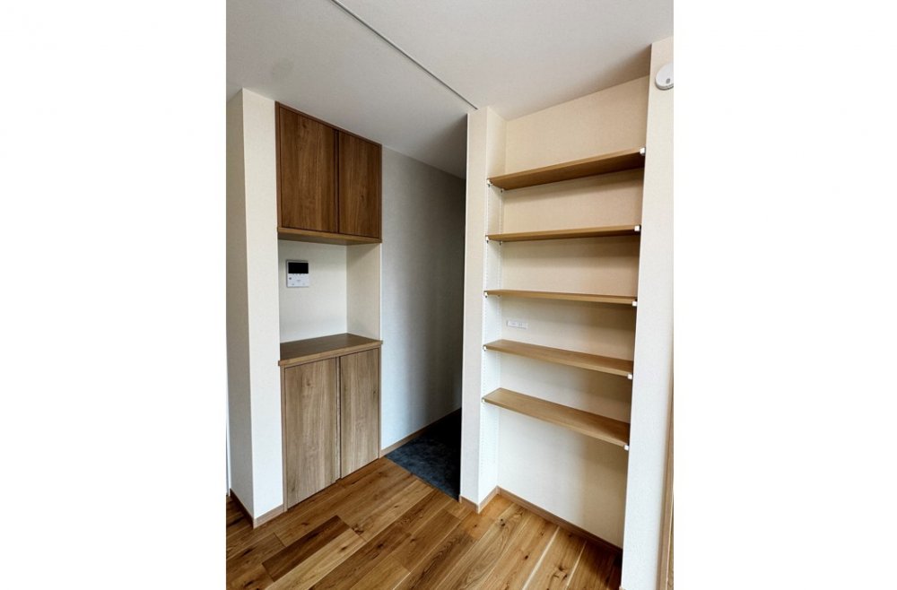 ダイニングスペースには、家族写真やお気に入りの雑貨を飾ったりと、ディスプレイを楽しめるオープン収納と、隠せる収納の2タイプの収納を設けました。