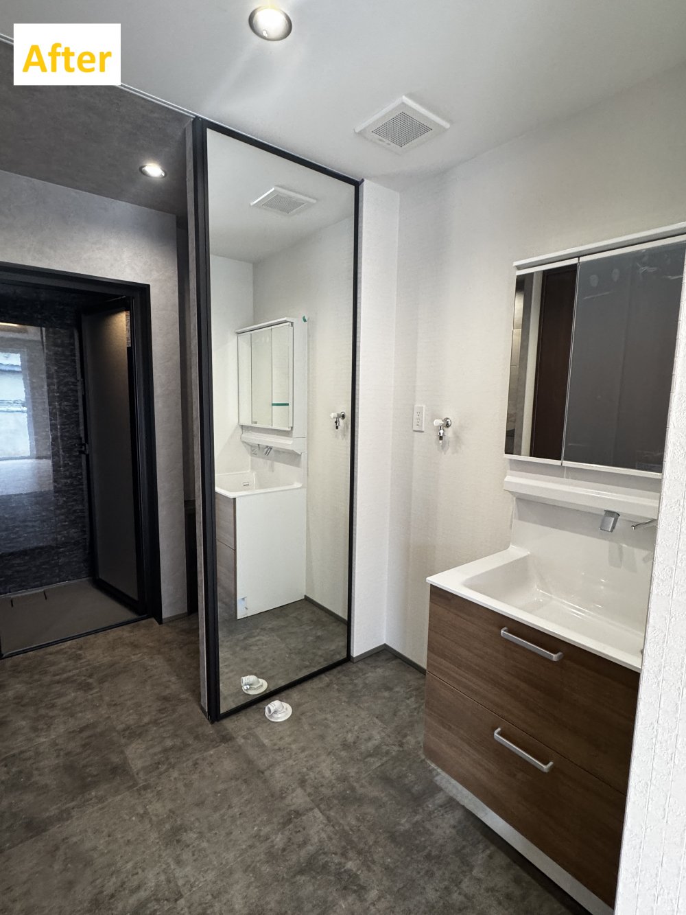 広々とした洗面室に!脱衣室との間に間仕切りドアを設け、家族が入浴中でも洗面台が使いやすくなりました。また、間仕切りドアは全身鏡となっており、身支度にも便利な空間に変身。