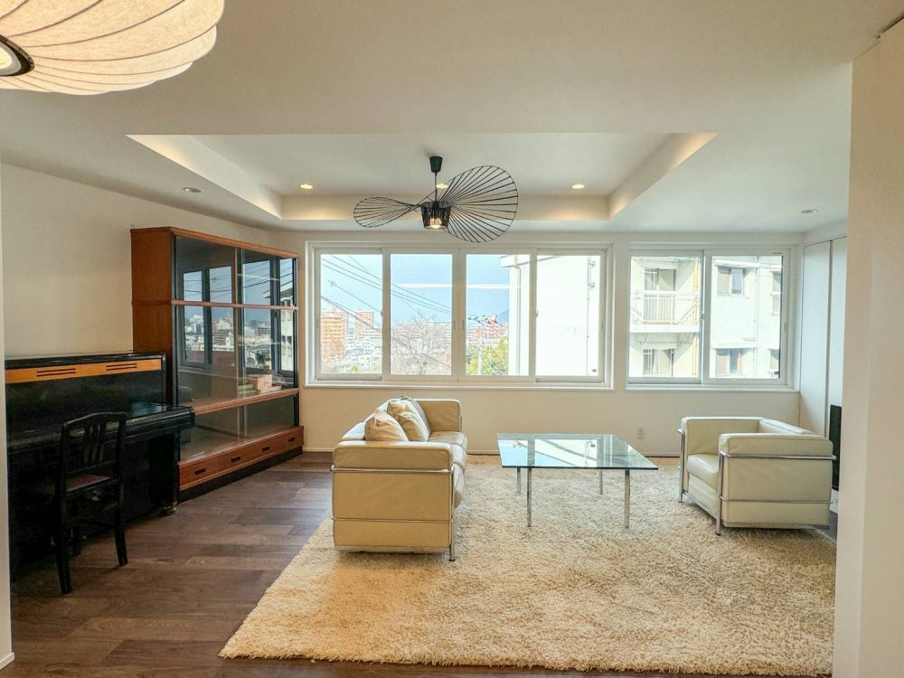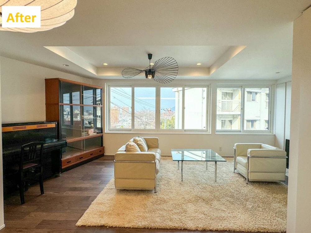 既存の大窓を活用しつつ、間仕切り壁を取り除き広々としたリビングに変身。天井を一部上げることで、開放感もプラス。