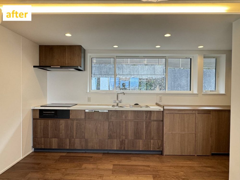 キッチンの場所を移動し、広々キッチンへ。また、間接照明を取り入れ、夜にはまた違った雰囲気を楽しめるおしゃれな空間に。