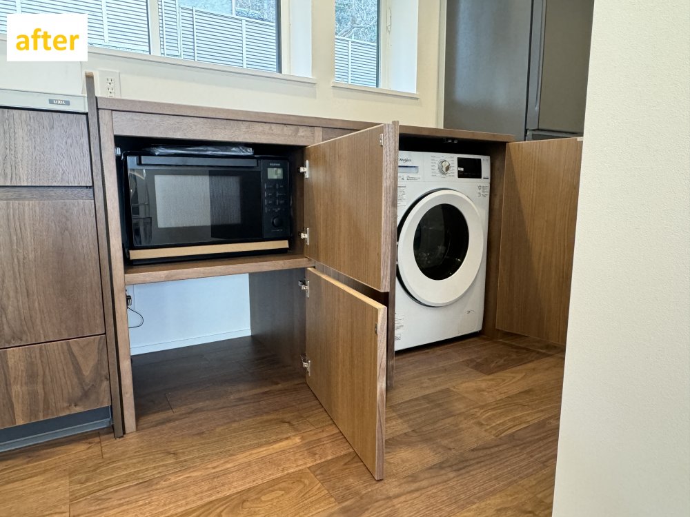 お住まいの地域ではキッチンに洗濯機が一般的だそうで、キッチンに洗濯機が隠れるように配置したいというご要望。キッチン横に電子レンジやドラム式洗濯機が収納できるスペースを造作しました。扉を閉めると家電が隠れ、スッキリとした空間に。