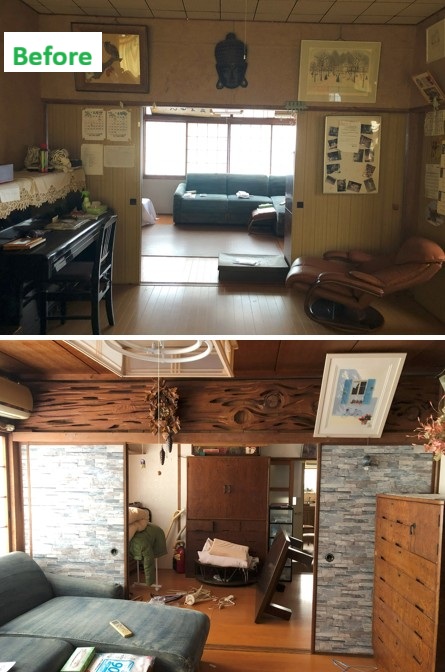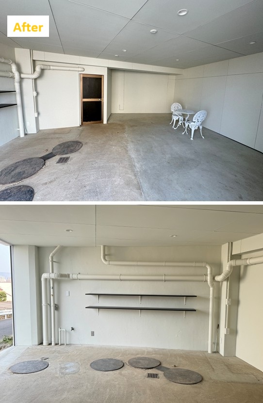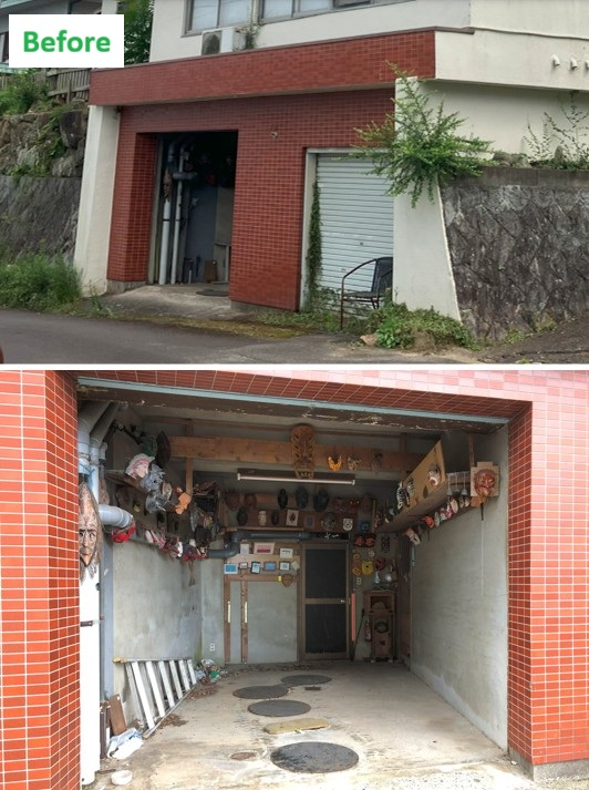 間仕切り壁を取り除き、一つの広々としたスペースに変身した車庫。駐車もしやすくなり、快適に!また、壁面にはちょこっとしたものを置ける棚を設置しました。